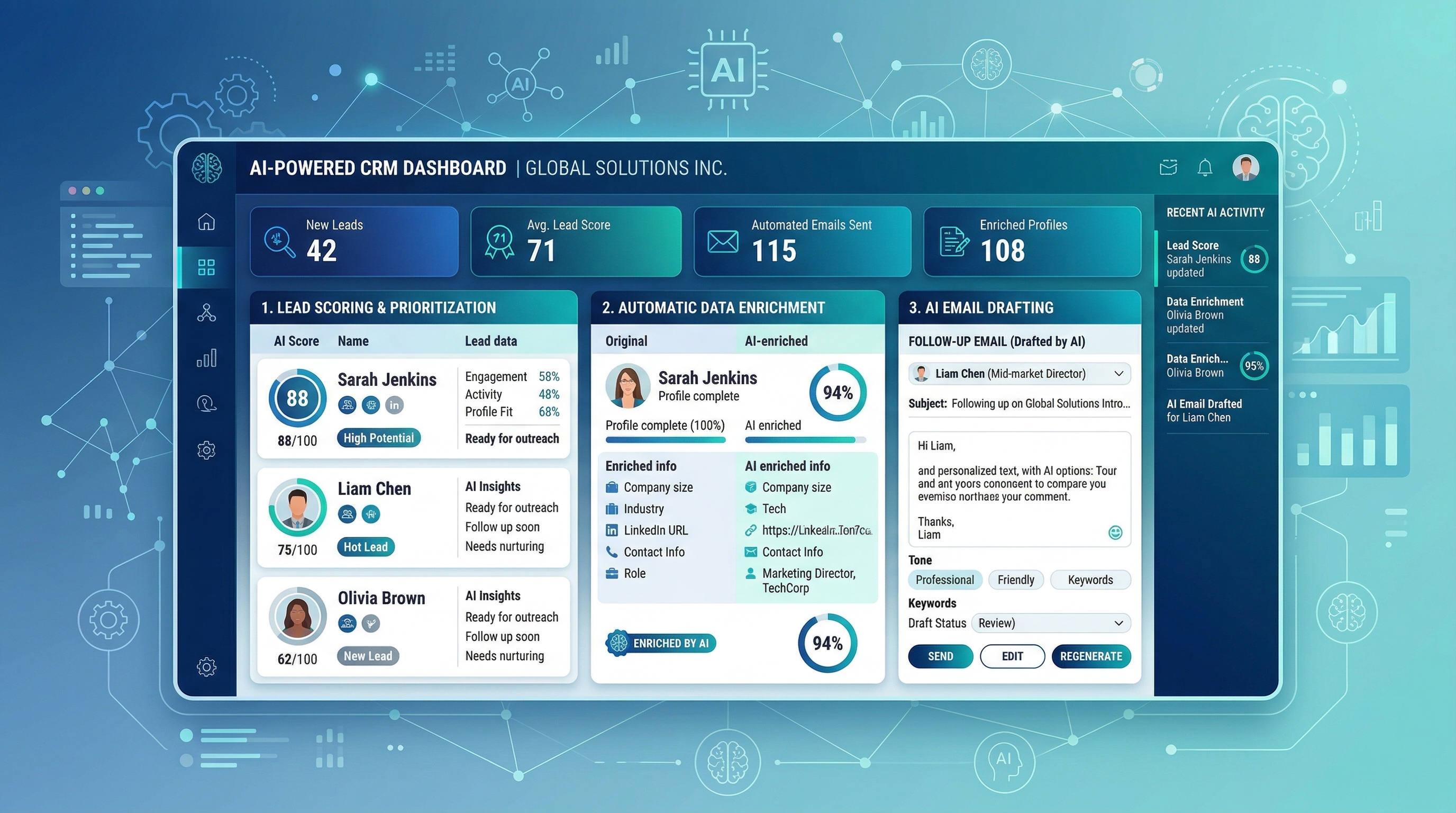 CRM data decays constantly. People change jobs, companies move, phone numbers change. AI tools can automatically enrich your contact records by pulling in up to date information from public sources. Company size, industry classification, recent news, social profiles, and more. This keeps your database accurate without anyone manually researching and updating records.